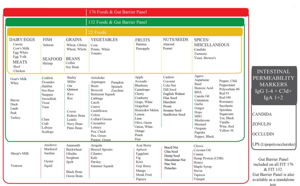 The FIT 22 test measures sensitivities of 22 different foods, colorings and additives spanning most major food groups and leaky gut.